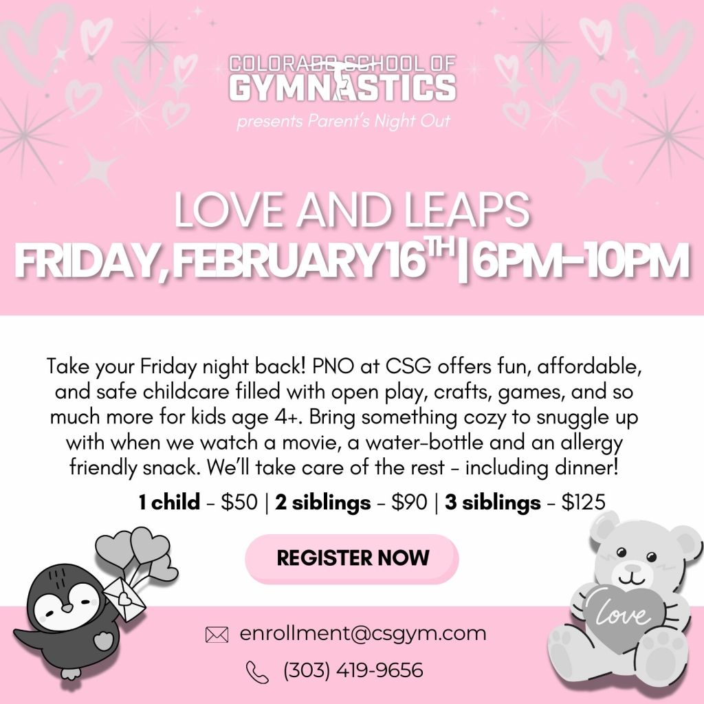 It’s time to take your Friday night back! Parent’s Night Out at the Colorado School of Gymnastics offers fun, affordable, and safe childcare so you can enjoy a few uninterrupted hours to run errands, plan a date night, catch up around the house, or simply relax in some well-earned peace and quiet. While you recharge, we’ll keep your kids busy, smiling, and moving—so everyone heads home happily worn out, ready for a great night’s sleep and (fingers crossed!) a slower start to the weekend.